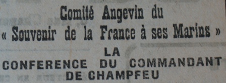 Le gala organisé par le Comité Angevin du Souvenir de la France à ses Marins est un grand succès grâce à la conférence menée par le comte de Champfeu. Cette conférence intervient sur les questions maritimes pendant la guerre, un sujet que maitrise parfaitement bien M. Champfeu car lui-même a été marin et même commandant. Il est, en plus, un grand orateur et a « su tenir son auditoire sous le charme pendant une grande heure ». La conférence de M. Champfeu est « très étudiée, très documentée et présentée avec méthode et clarté ». De la Manche à la Méditerranée, il explique le rôle de la marine et les stratégies de combat des différents pays en insistant davantage sur les exploits des marins françaises. La conférence se clôt au milieu des applaudissements du public, ravi de cette intervention. Un concert est ensuite donné par l’orchestre du Grand-Théâtre et des films sont projetés au cinéma.